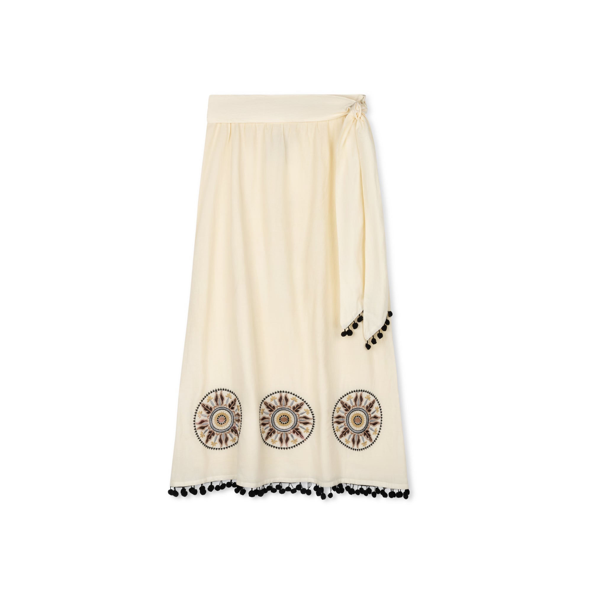 A unique mix of boho city-chic, this skirt features contrast blocking accents and intricate embroidered medallion design, finished with a waist tie and pom pom trims. Pair with the Cleo medallion blouse to complete the outfit.