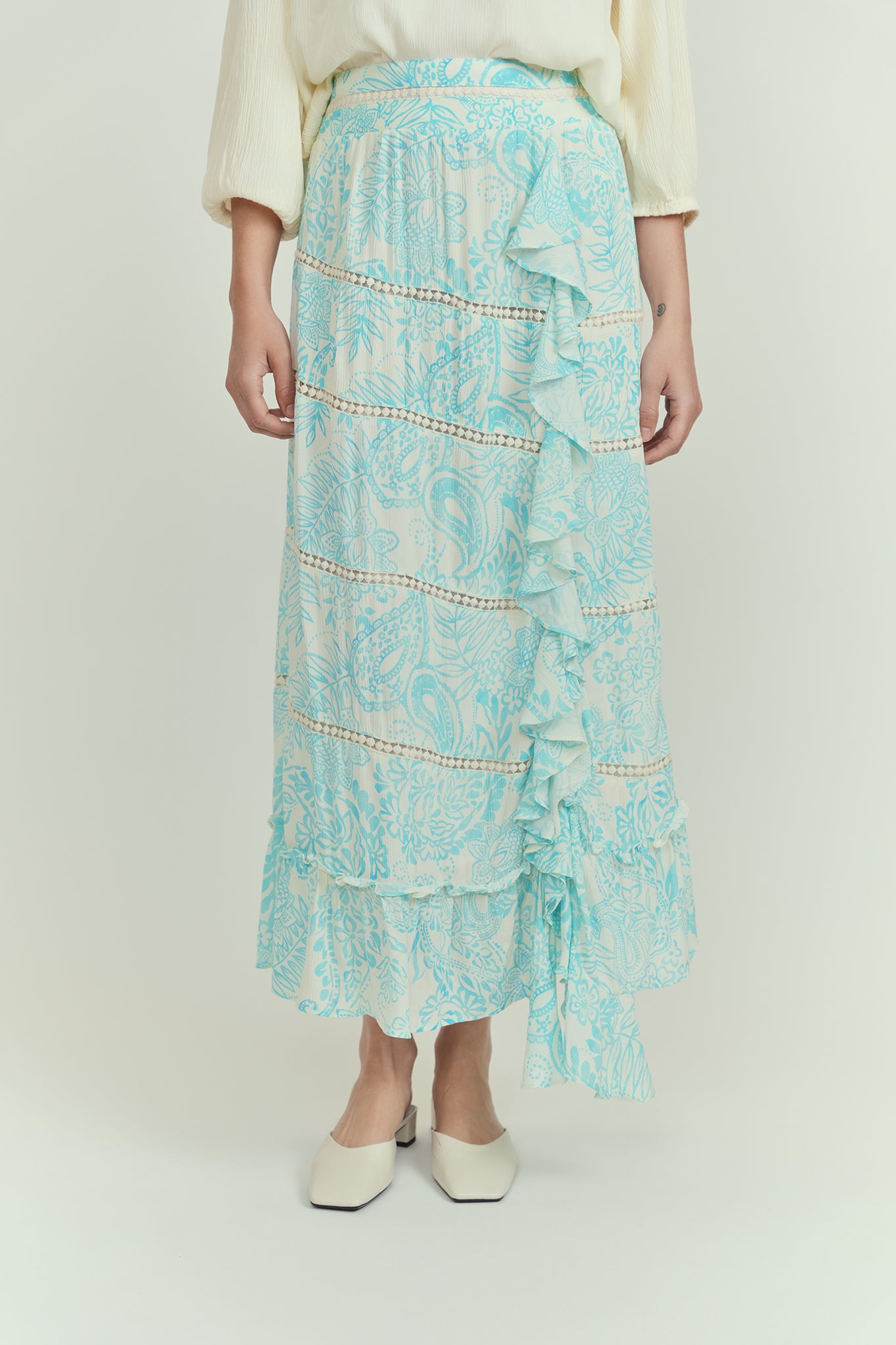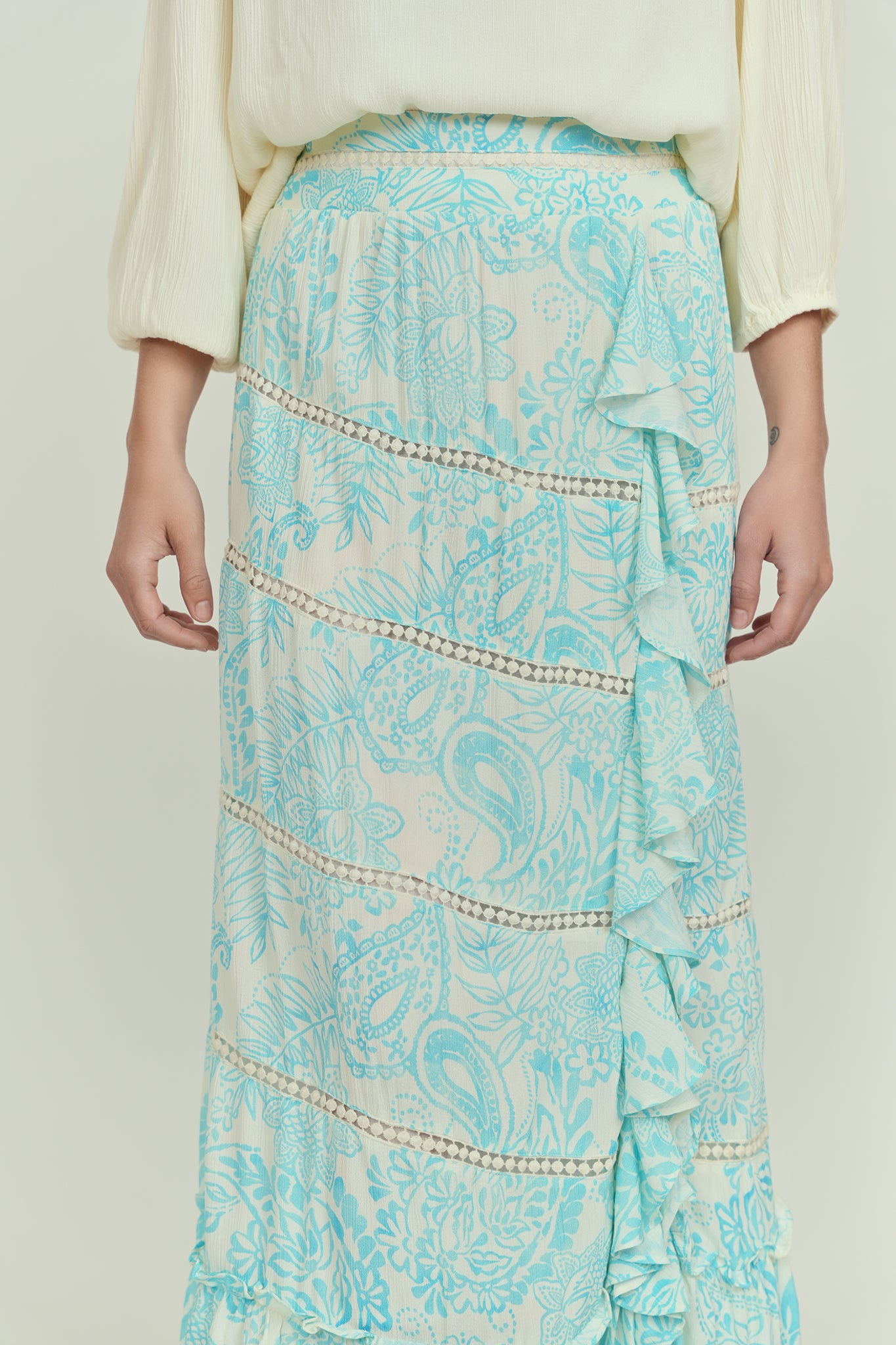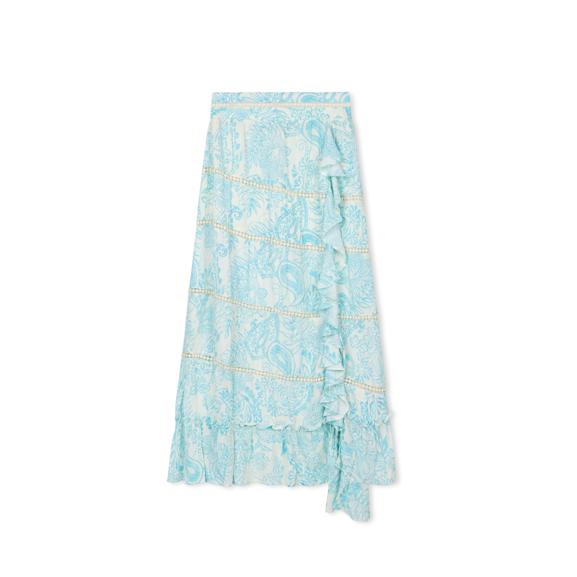 Soft watercolor paisley, delicate cascade ruffles and crochet trim captures that carefree bohemian elegance. Light, and effortless--this skirt is made for sun drenched days and dreamy escapes.