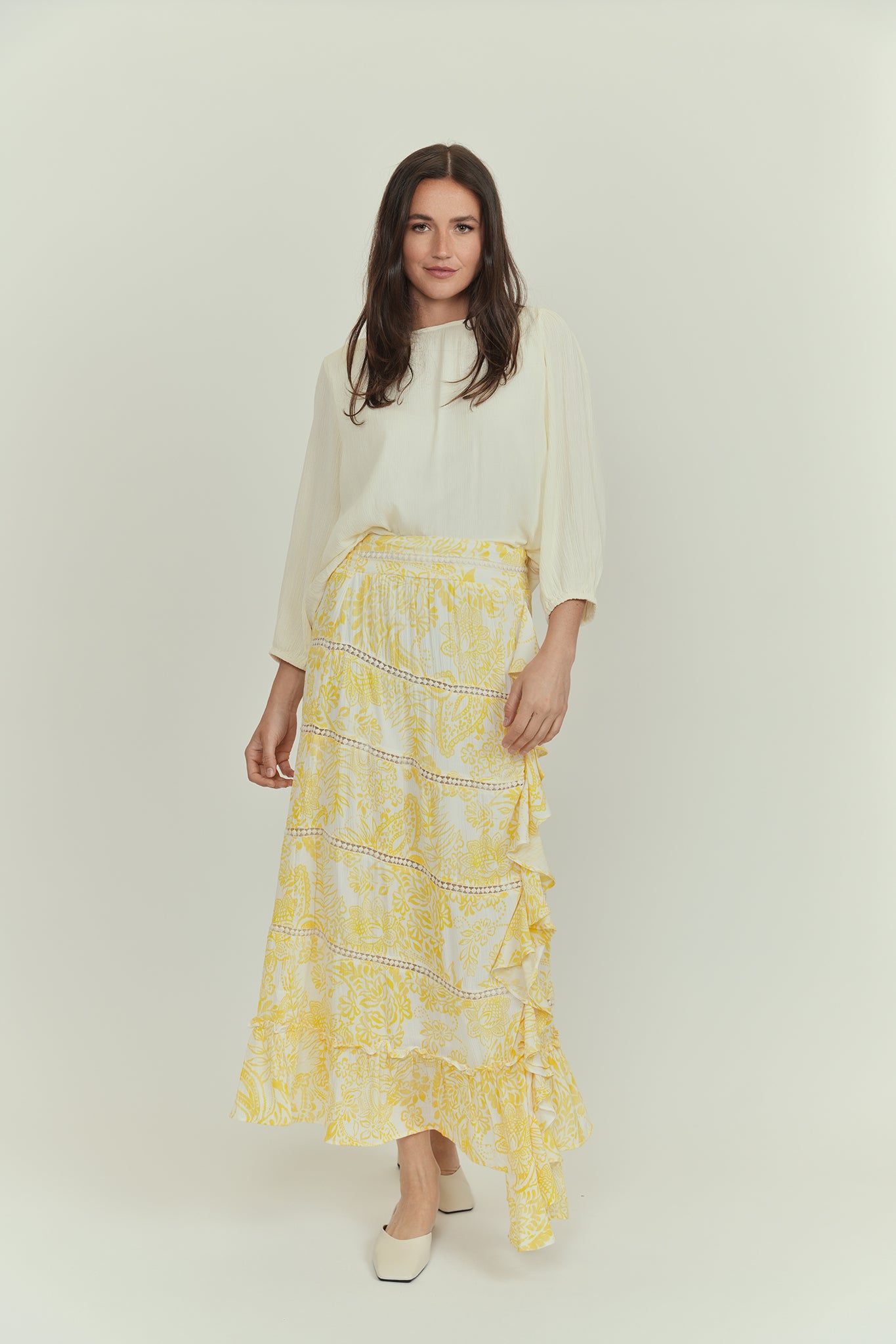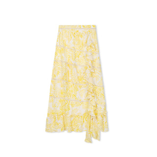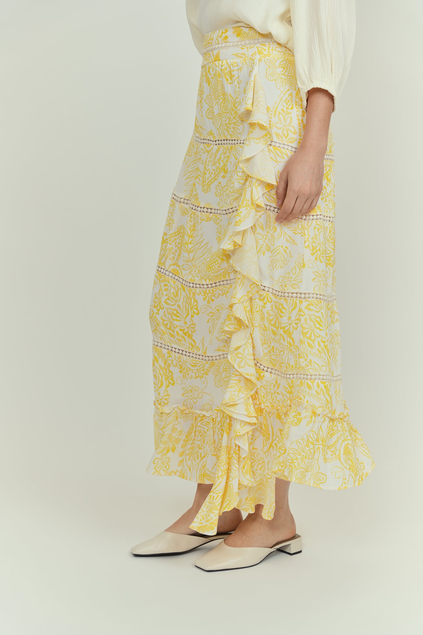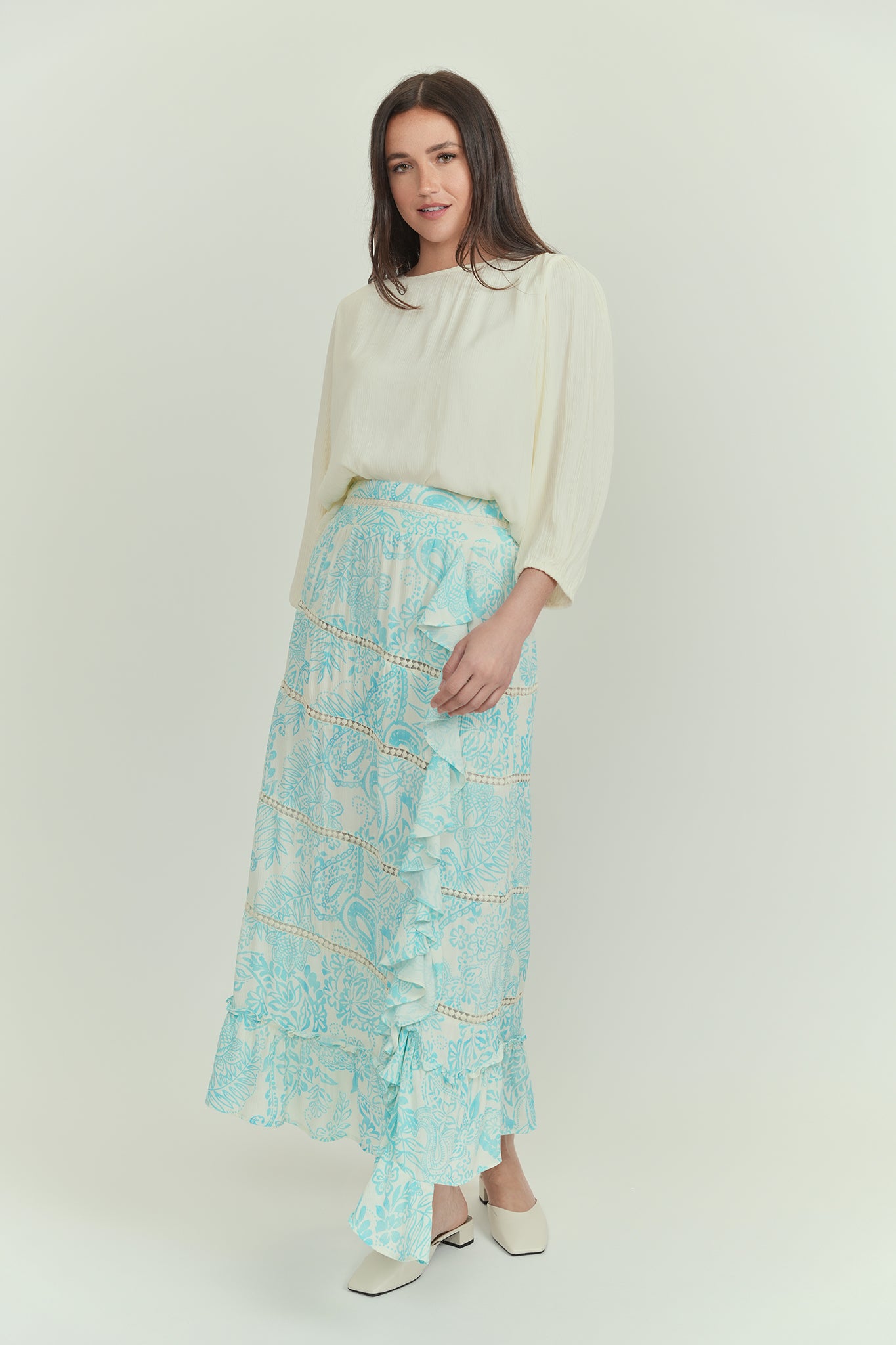Soft watercolor paisley, delicate cascade ruffles and crochet trim captures that carefree bohemian elegance. Light, and effortless--this skirt is made for sun drenched days and dreamy escapes.