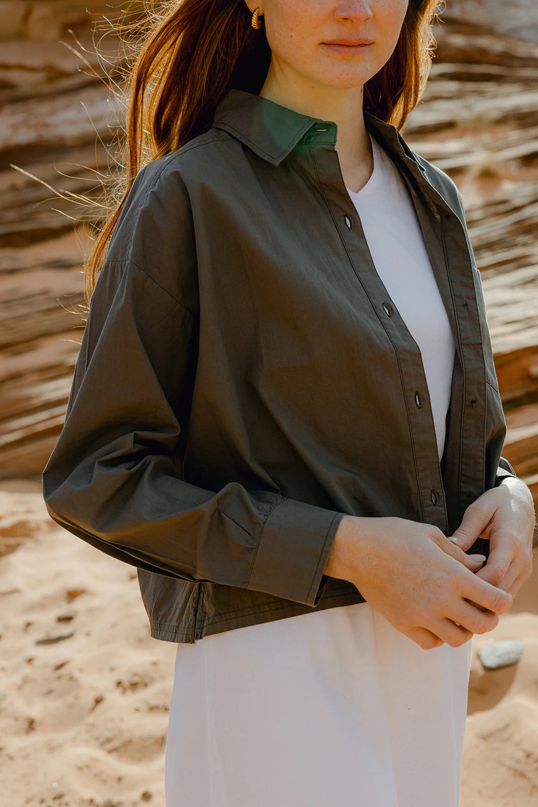 Make a timeless style statement no matter the occasion in our Point Cropped Poplin Button Up, crafted from luxurious cotton for a sumptuously comfortable feel. With its effortless elegance, this must-have design is the ideal choice for a cozy yet polished look on a night out with the girls.
