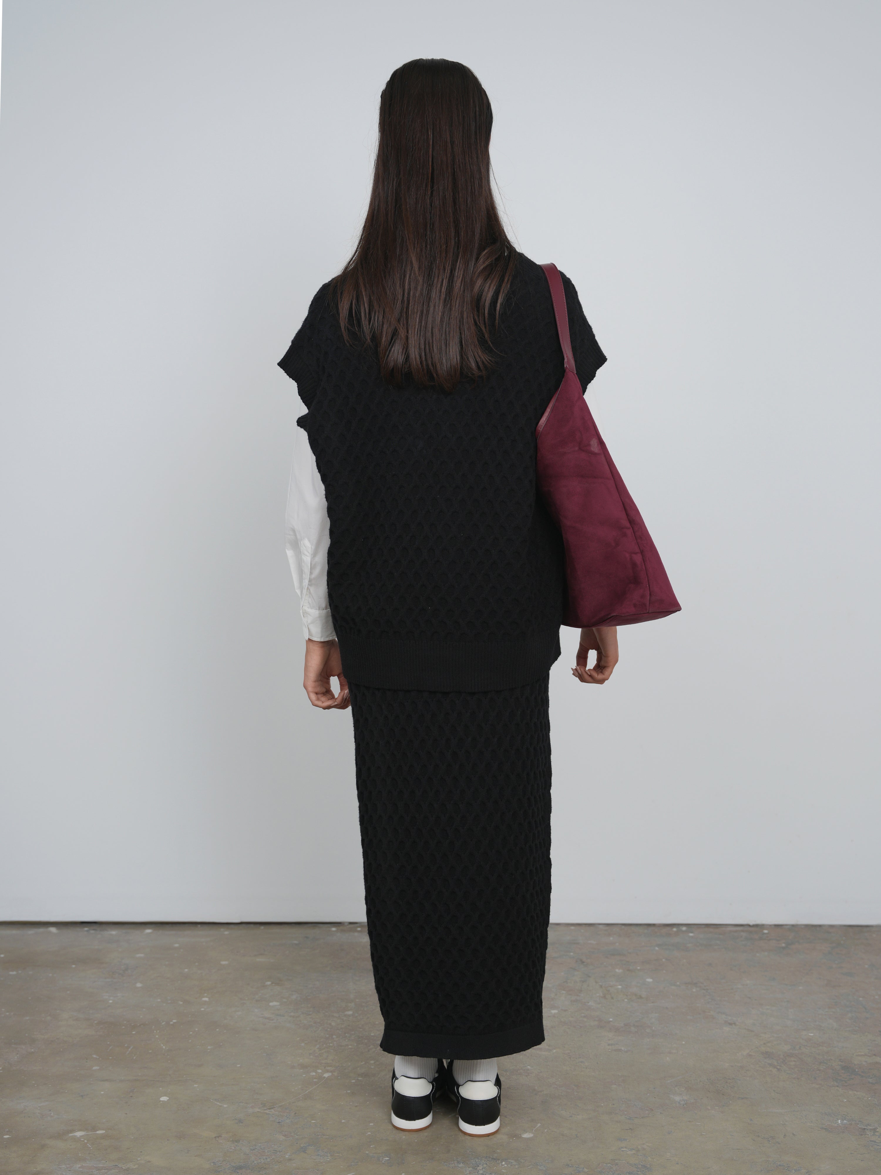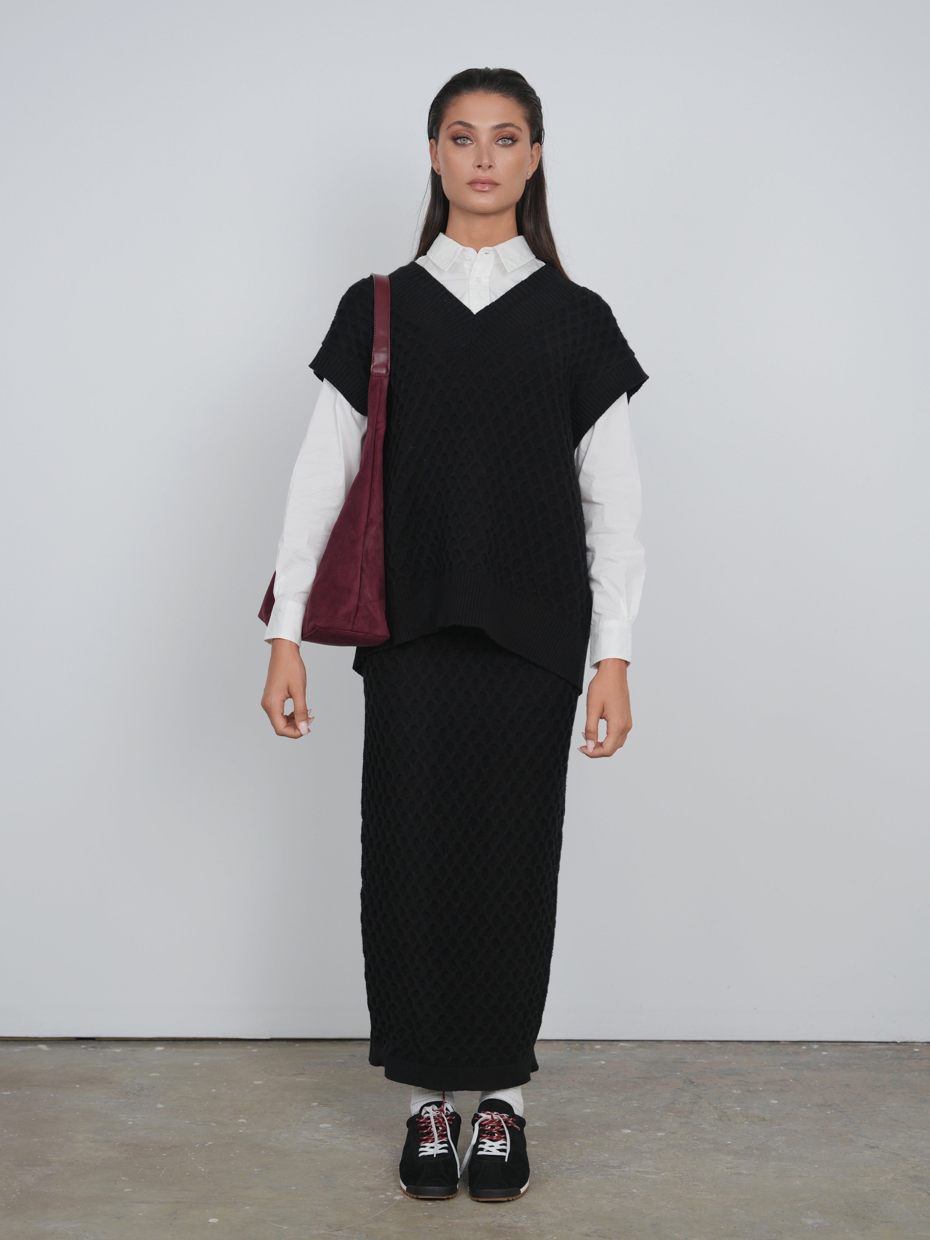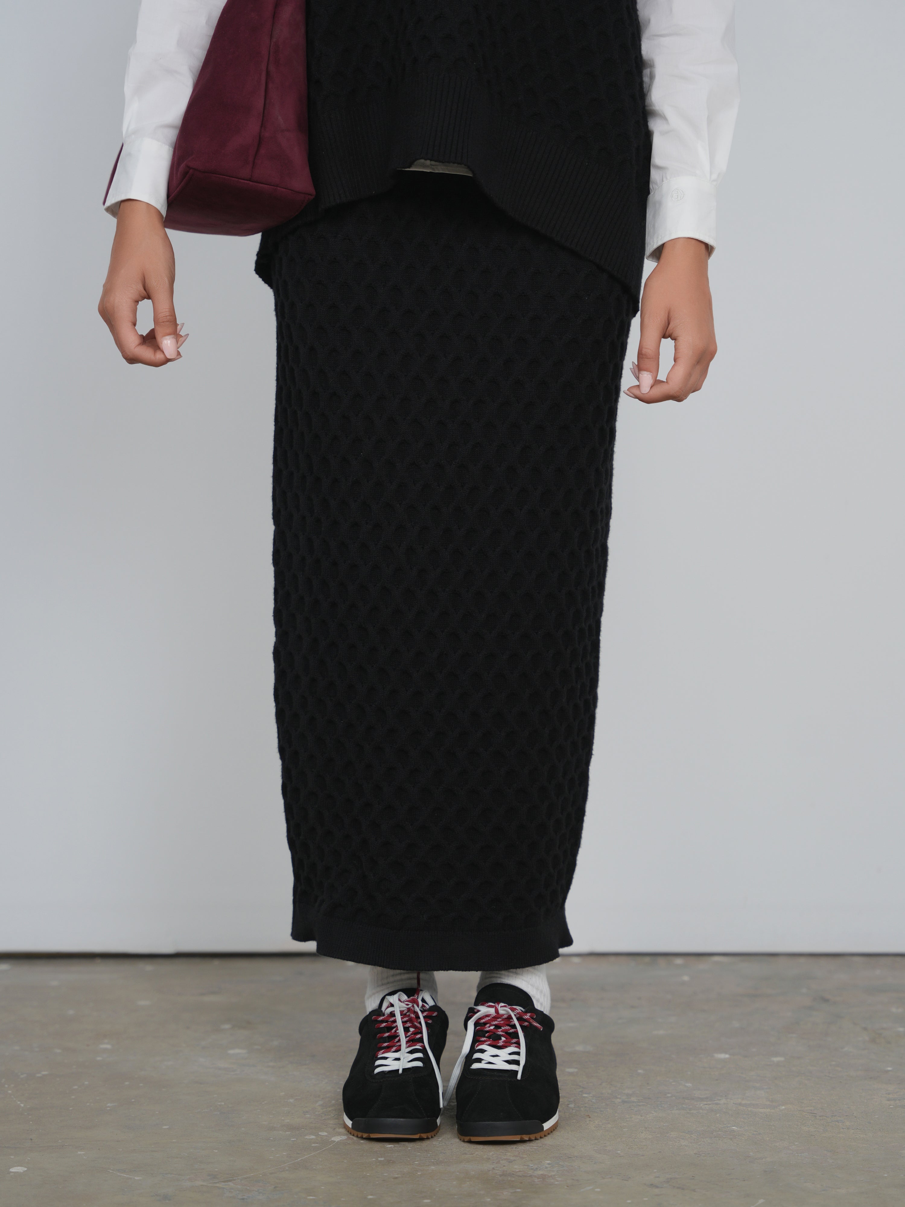 The Point Straight Knit Maxi Skirt combines elegant simplicity with contemporary comfort. Its sleek, straight silhouette elongates the figure, while the soft knit fabric ensures a flattering drape and ease of movement. Perfectly versatile, this maxi skirt transitions effortlessly from casual daytime looks to refined evening ensembles, making it a sophisticated foundation for any wardrobe.