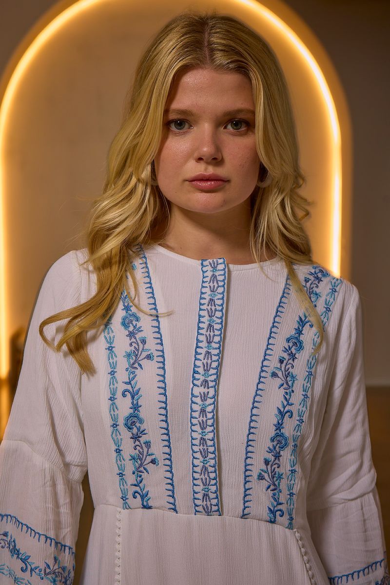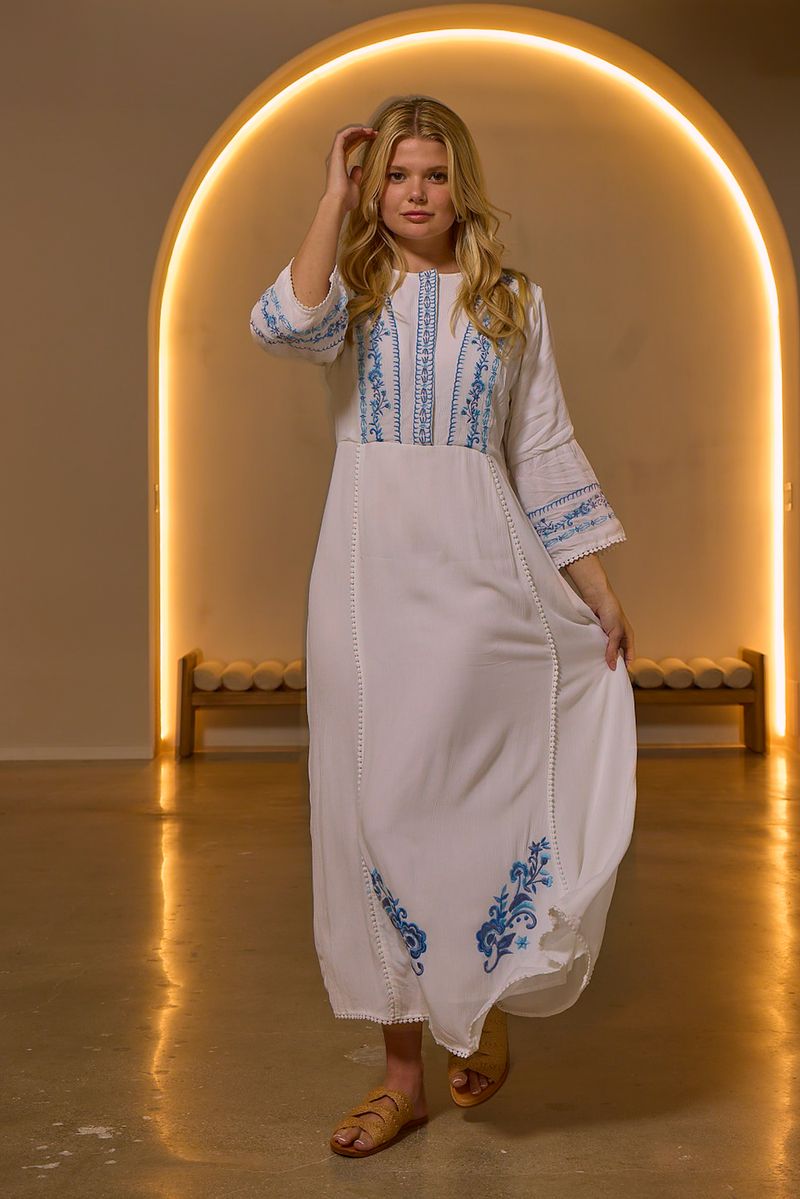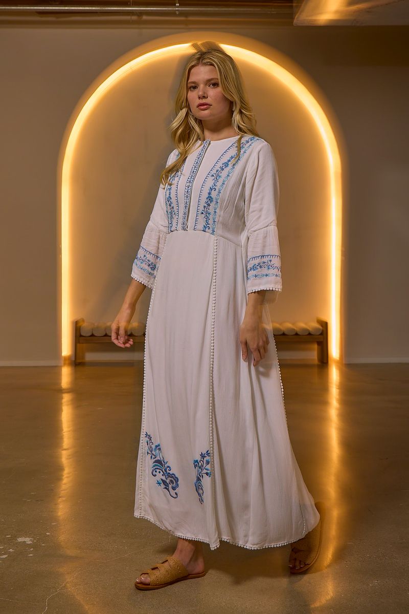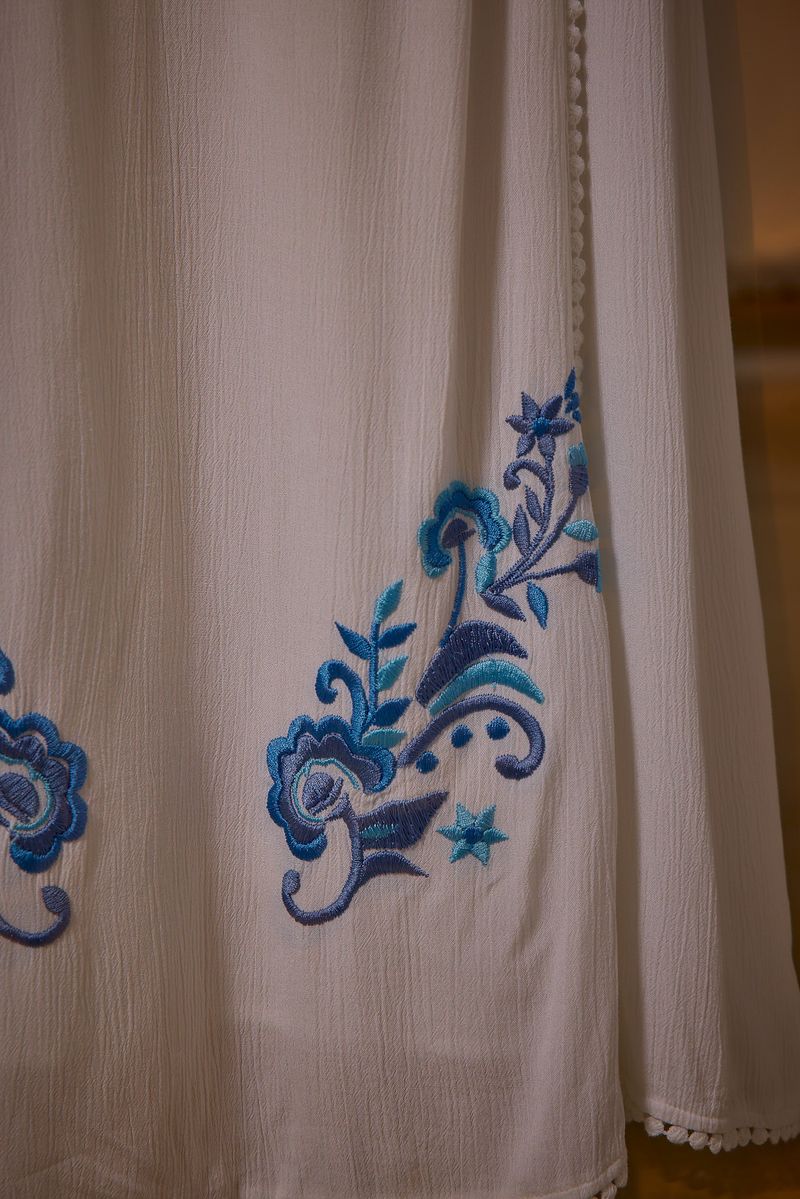 A dress inspired by the effortless beauty of Mediterranean coastal life. Sun-kissed blue florals and a scalloped trim bring an artisanal feel. A true bohemian piece for any occasion that calls for timeless beauty.
