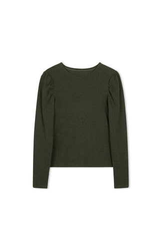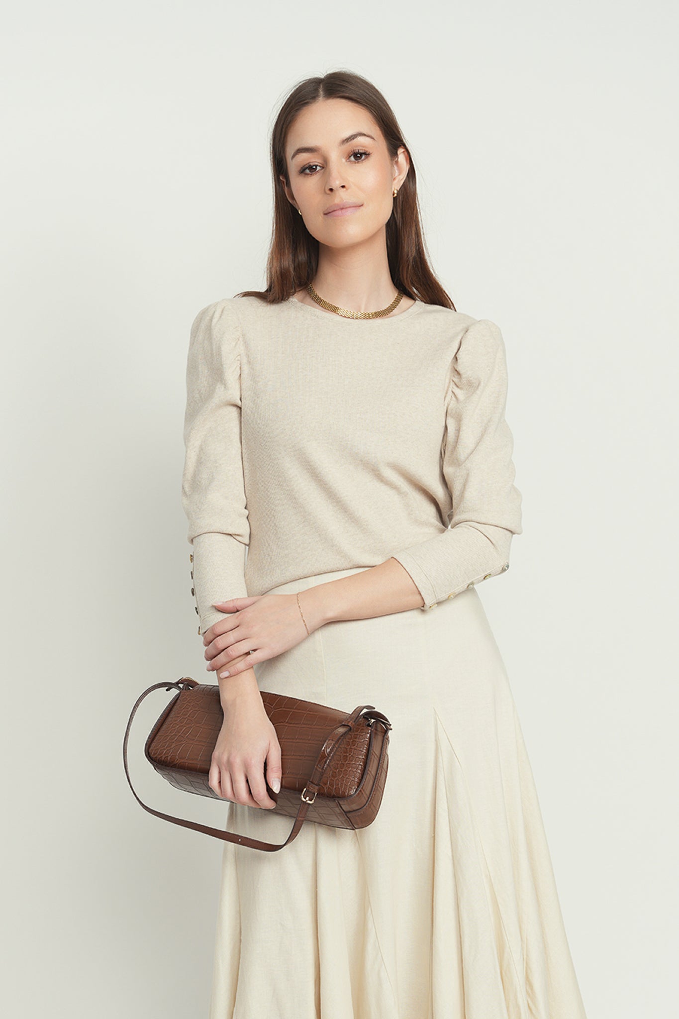 This cloud-soft top brings feminine polish with mini-puff shoulders and charming button accents along the wristline. Wear it on afternoons spent outdoors sipping lattes or to gatherings that invite simple sophistication.