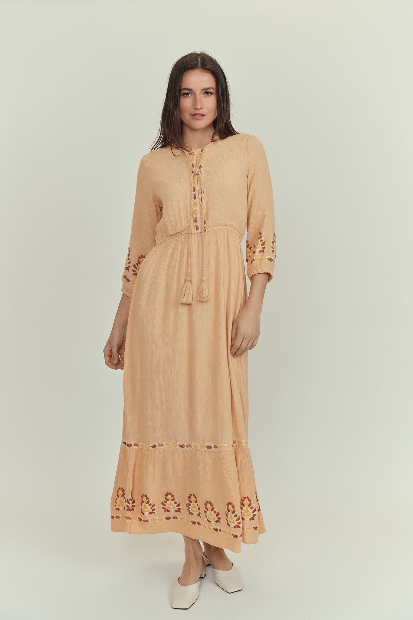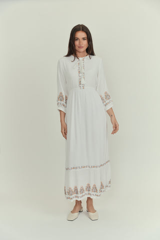 Light, airy and adorned with artisanal floral embroidery, this dress strikes the perfect balance between dressing up and down. Billowy sleeves and soft tiers add the perfect feminine touch.